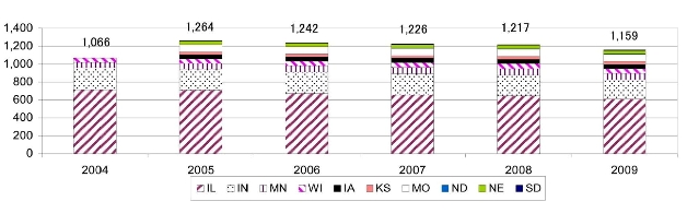 In 2009, 1,159 Japanese business facilities were located in the 10-state area. The 4.8% decline was due to the economic slowdown worldwide. Illinois ranked first with 53% of the business facilities, followed by Indiana with 19%.